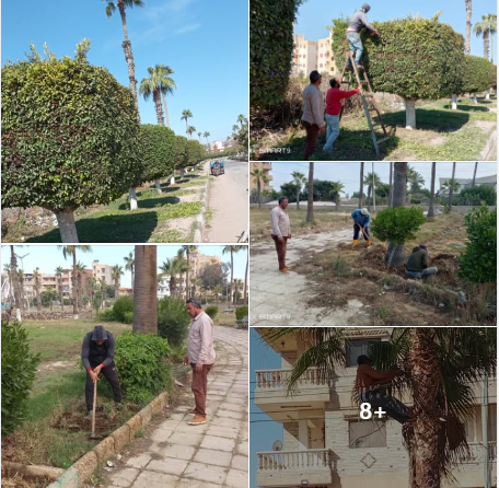 حيث تم قص الأشجار والأسوار في المدخل الرئيسي وعزيق الحشائش والنباتات الغربية في حديقه ابن لقمان وتاليم النخيل في شارع فندق 6اكتوبر