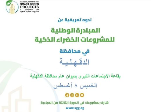 تعلن محافظة الدقهلية عن عقد ندوة تعريفية عن المبادرة الوطنية للمشروعات الخضراء الذكية يوم الخميس ٨ أغسطس بقاعة الاجتماعات الكبرى بديوان عام محافظة الدقهلية الساعة ١١ صباحاً