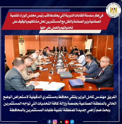 الفريق مهندس كامل الوزير يلتقي محافظ ومستثمري الدقهلية لاستعراض الوضع الحالي بالمنطقة الصناعية بجمصة وإزالة كافة التحديات التي تواجه المستثمرين وبحث ضم أراضي جديدة للمنطقة لتلبية طلبات المستثمرين بالمحافظة .