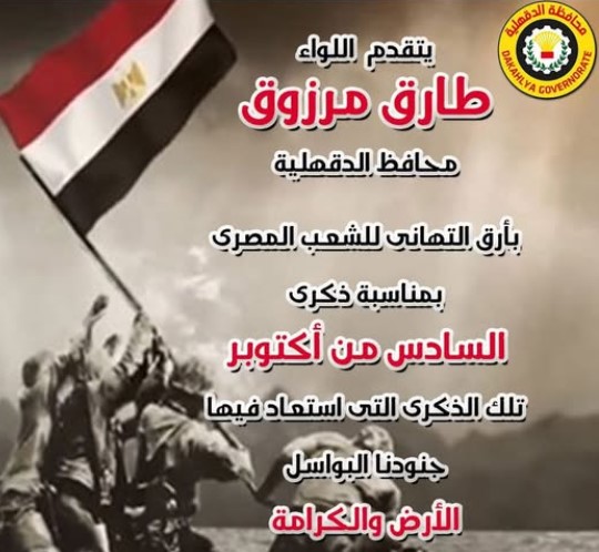 يتقدم اللواء طارق مرزوق محافظ الدقهلية بالتهنئة لأهالي الدقهلية وشعب مصر بمناسبة الاحتفال بذكرى انتصارات أكتوبر المجيدة وقال : " يسعدني ويشرفني أن أتقدم لأهالي الدقهلية ، وشعب مصر العظيم بالأصالة عن نفسي ، وبالإنابة عن الجهاز التنفيذي بالمحافظة ، بخالص التهاني وأصدق الأماني بمناسبة الإحتفال بذكرى انتصارات أكتوبر المجيدة ، وأسأل الله عز وجل أن يعيدها علينا بدوام السعادة والتقدم ، وأن يحفظ مصر والدقهلية وشعبها من كل مكروه وسوء ، وأن يجمعنا دائما على الخير وأن يحقق لنا كل ما نتمناه " .